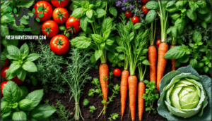 Beyond strategic placement, you can utilize edible flowers and herbs that naturally repel insects through their essential oils and active compounds. These repellent plants for edible gardens offer flower-based mechanisms and repellent herb efficacy that transform your garden into a self-defending ecosystem.