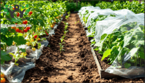 Row covers made from spun-bonded polyethylene or polypropylene create physical barriers that block pests while letting 70–95% of light through. These lightweight materials can cut pest infestations by up to 100% when you seal edges tight at planting. Just remember to remove covers during flowering so pollinators can access your crops.