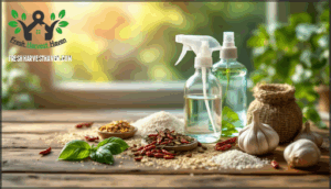 Beyond your pantry, you’ll find powerful organic solutions in essential oil spray formulations. Peppermint, clove, and neem oils deliver over 80% mortality against aphids and mites while meeting regulatory status as minimum-risk pesticides exempt from EPA registration.