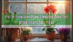 Your winter houseplants won’t bloom without the right light intensity—think 10,000 to 20,000 lux of bright light filtering through south-facing windows. Window placement matters most during darker months, but artificial lighting can bridge the gap when natural rays fall short.